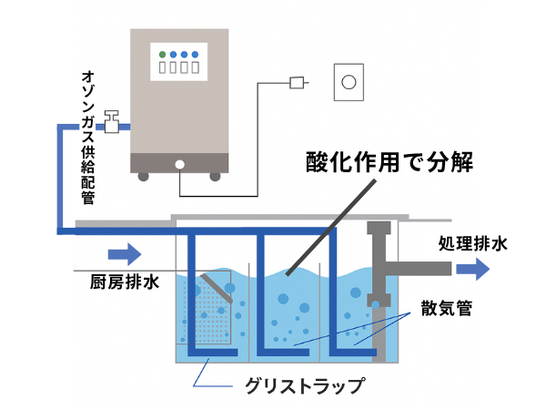 オゾンの酸化力により、手作業では落としきれないグリストラップ内の汚れやヌメリを抑制。 - 薬剤不要・環境負荷ゼロ