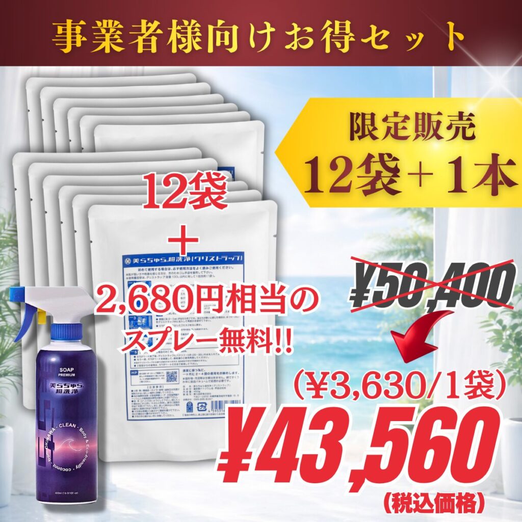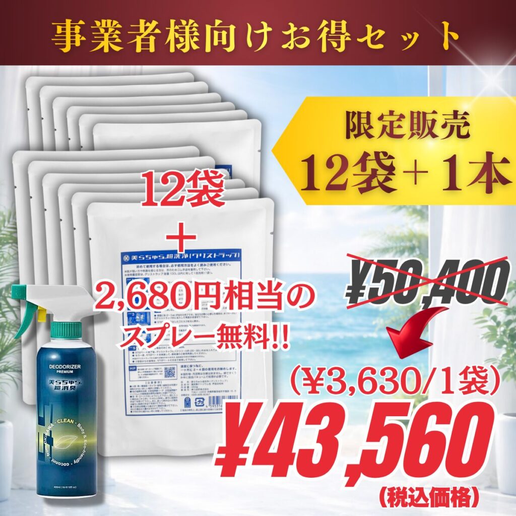 事業者向け12袋セット以上には、2,680円相当のスプレー1本(超洗浄or超消臭)が無料特典付き!↓