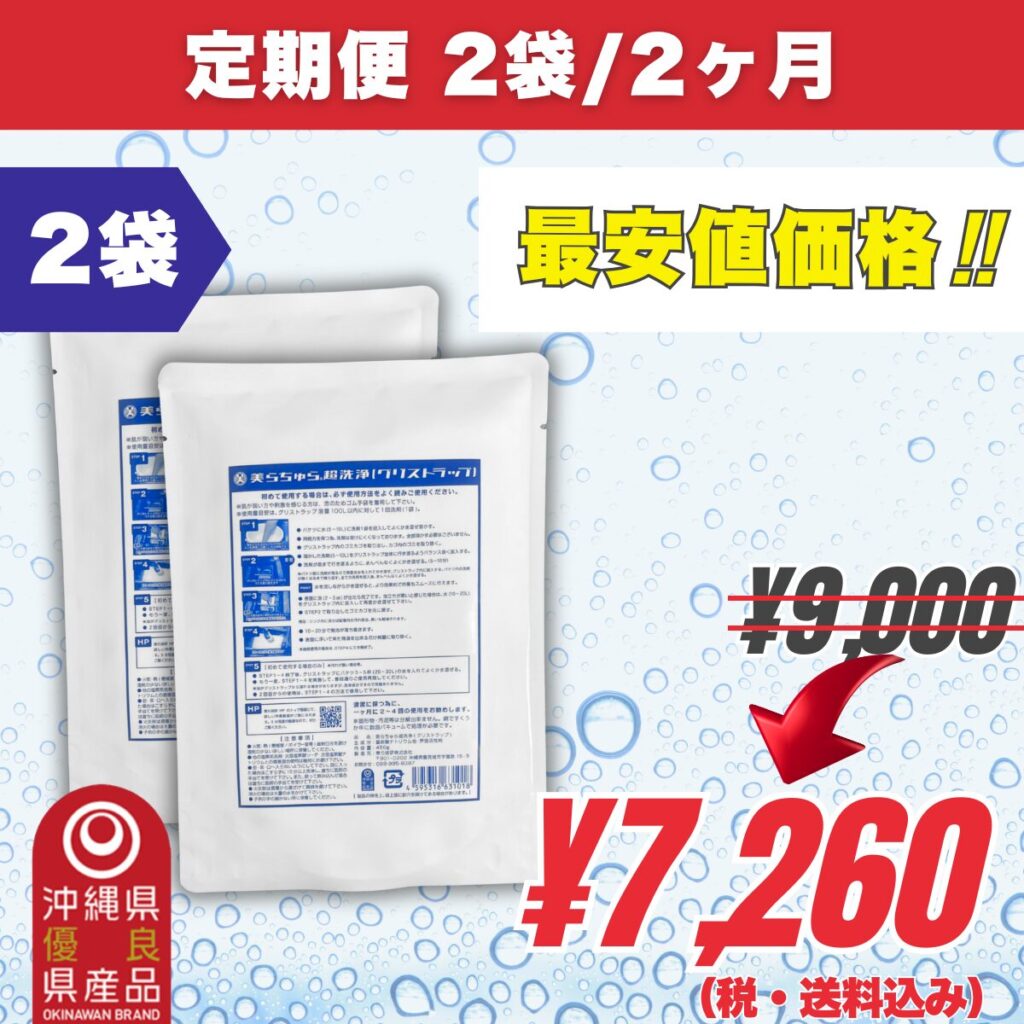 飲食店でのグリストラップ業者清掃の相場は、規模や頻度によって異なりますが月額1〜3万円程度が一般的です。美らちゅら超洗浄を月2〜4回使用した場合のコストは以下の通りです。