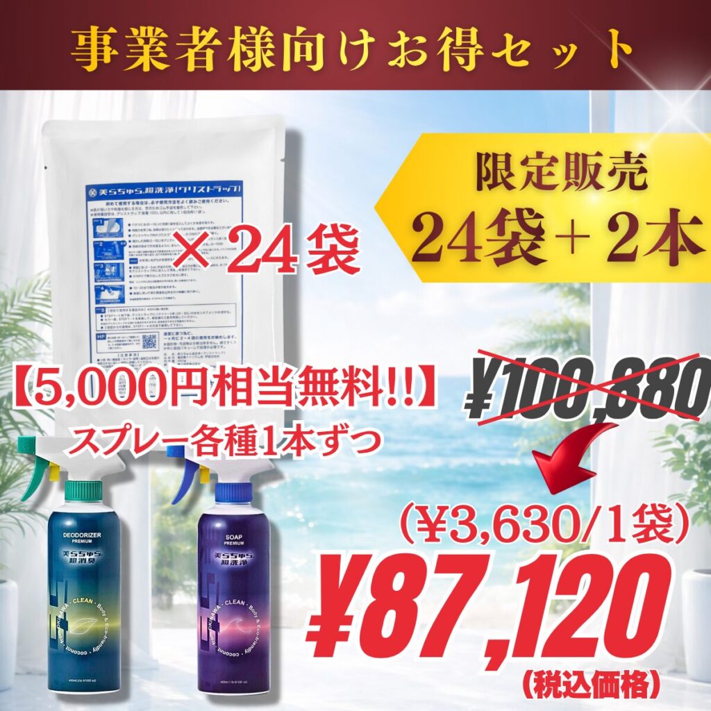 事業者向け24袋セット以上には、5,000円相当のスプレー2本(超洗浄・超消臭)が無料特典付き!