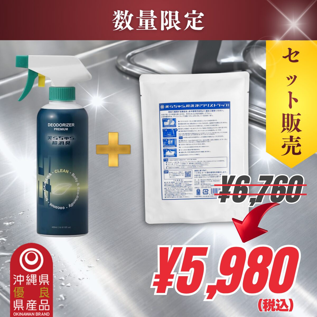 飲食店など、清掃のプロの現場でも使用されている、人と環境にやさしい「ノンアルコール消臭スプレー」と「グリストラップ用洗剤」の個数限定セット販売です。